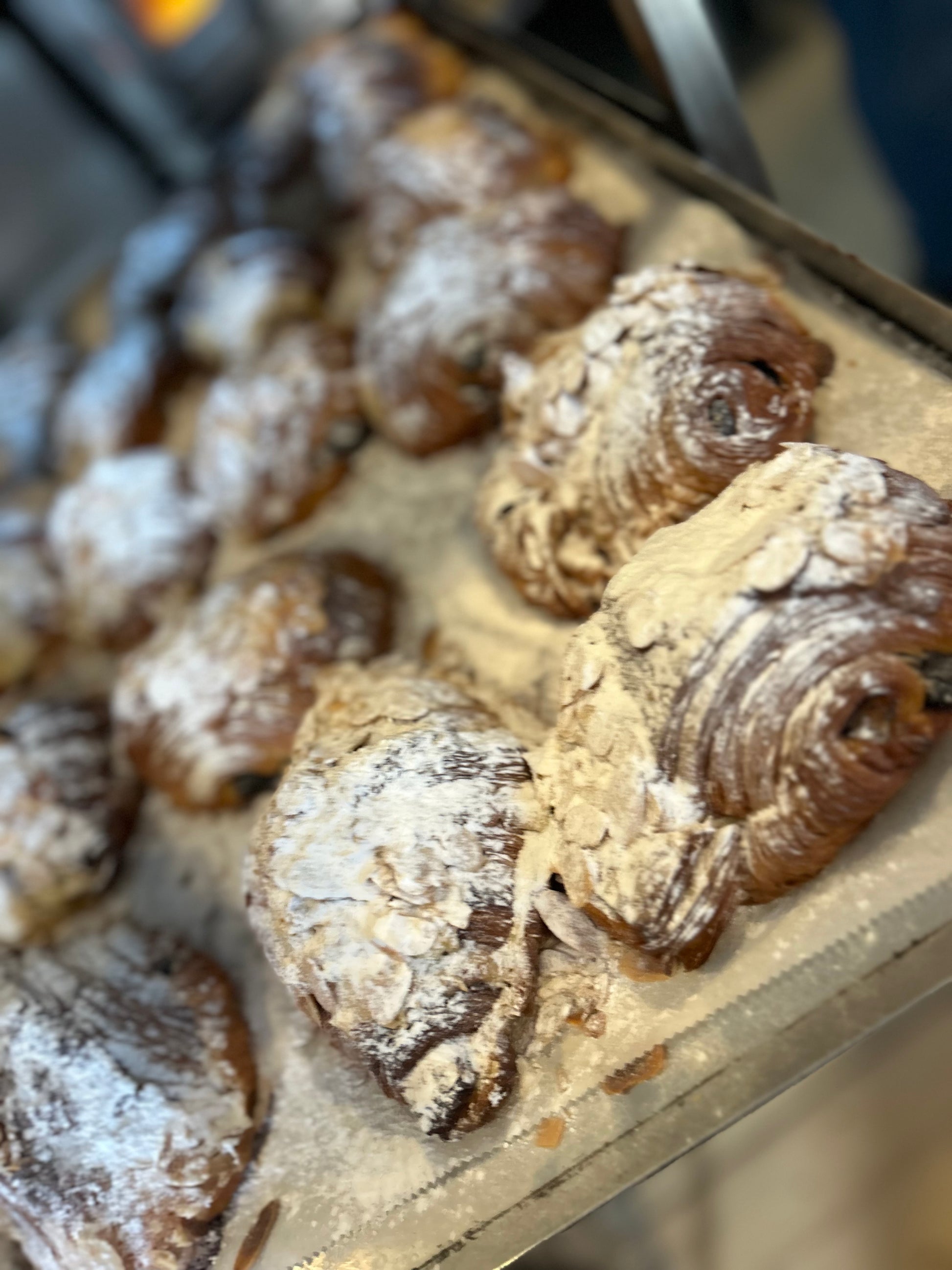 Twice baked pain au chocolat. Containing rum infused syrup, filled with our house made fragipane, topped with flaked almonds.